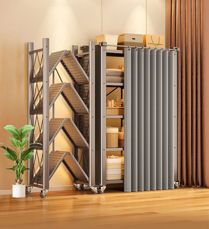Tên sản phẩm: Kệ thép chịu lực 5 tầng xếp gọn có bánh xe và rèm kéo cao cấp Freestanding Metal Iron Shelf