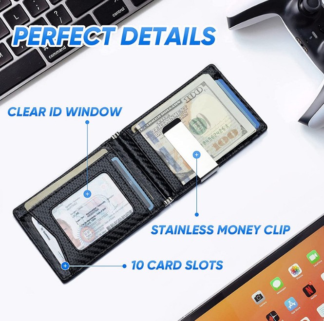 – Tối giản và sức chứa lớn: Ví mỏng có kích thước 4,3″x3″ có kẹp tiền có 10 khe cắm thẻ và 1 cửa sổ ID, có thể chứa hơn 11 thẻ và một số hóa đơn.